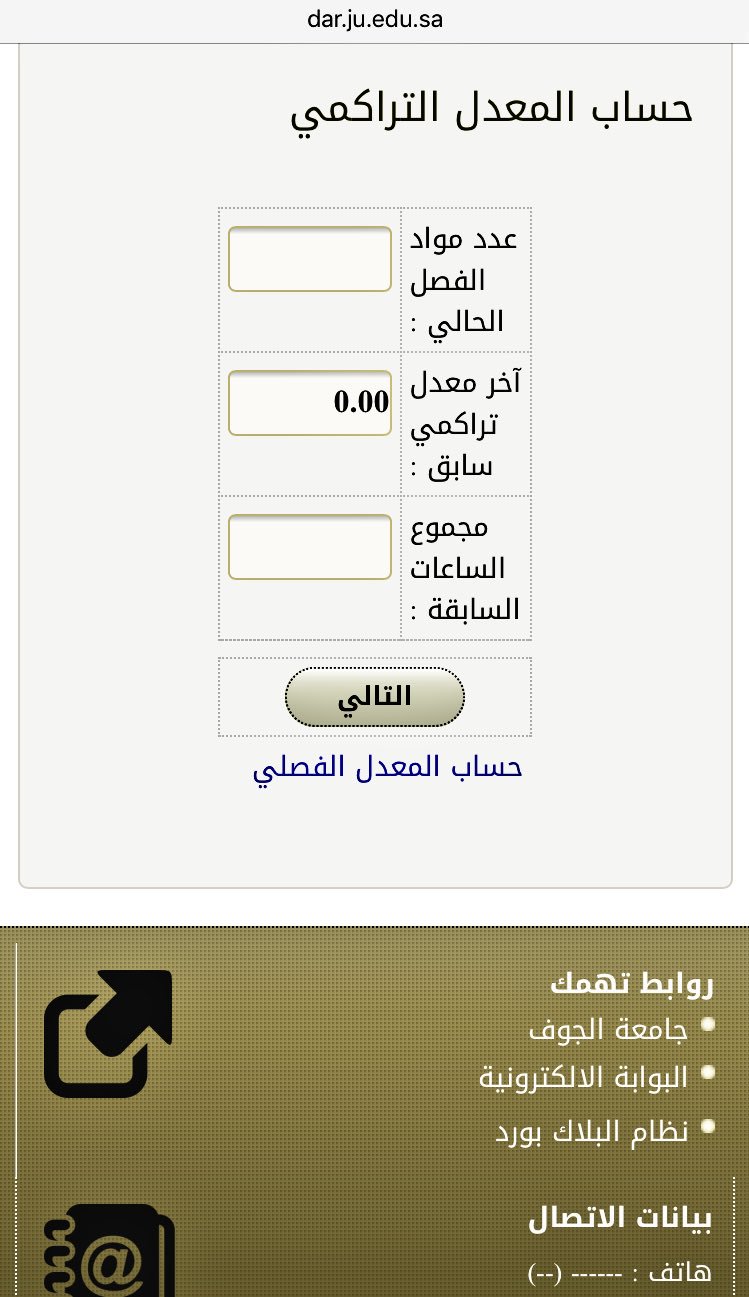 حساب المعدل يقوم النظام بمساعدة الطلاب في حساب معدلاتهم الفصلية التراكمية بكل يسر وسهولة ويعتمد بذلك على القيم المدخلة من قبل الطالب. تعتبر عمادة القبول والتسجيل بجامعة الجوف من العمادات المحورية في العملية الاكاديمية في الجامعة حيث انها تخدم اللبنة الأساسية التي من اجلها المزيد. تعتبر عمادة القبول والتسجيل بجامعة الجوف من العمادات المحورية في العملية الاكاديمية في الجامعة حيث انها تخدم اللبنة الأساسية التي من اجلها المزيد. إجمالي ساعات الدراسة طوال فترة الفصل الدراسي.