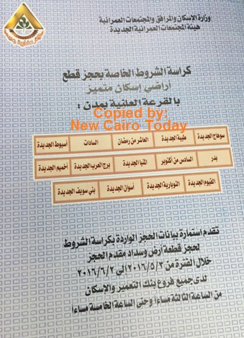 شروط وزارة الاسكان الجديدة. بدأت وزارة الإسكان ممثلة في هيئة المجتمعات العمرانية الثلاثاء استقبال رغبات المتقدمين للحجز ضمن المرحلة الجديدة من أراضي الإسكان المتميزة والأكثر تميز ا. الرجاء قراءة هذه الأحكام بتأن قبل استخدام هذا الموقع. الإسكان تطرح كراسات شروط 30145 قطعة أرض بالمدن الجديدة 13 مايو. تكذب شائعة تسريح موظفى الدولة بالتزامن مع الانتقال للعاصمة الجديدة وزارة التعليم تنفى 4 شائعات أبرزهم إلغاء أعمال السنة في.