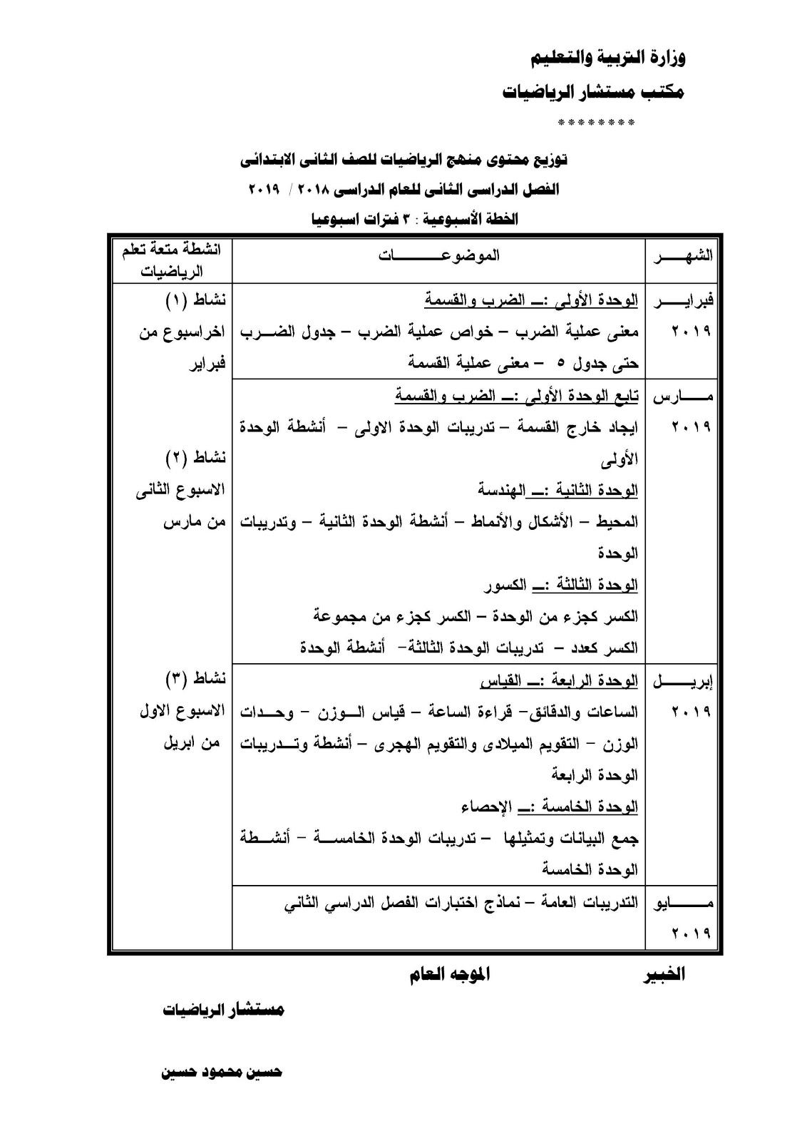 توزيع منهج الرياضيات للمرحلة الإبتدائية الترم الثانى 2018 2019