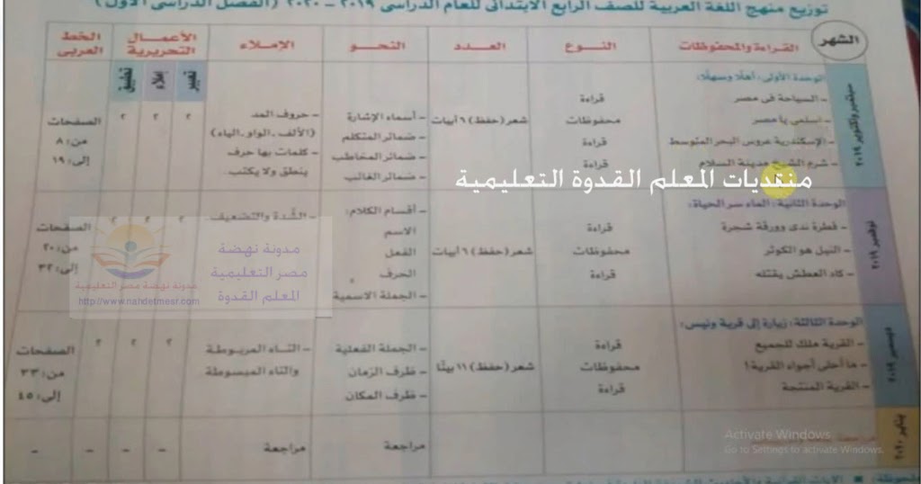 توزيع منهج اللغة العربية للصف الرابع الابتدائى الترم الاول 2020